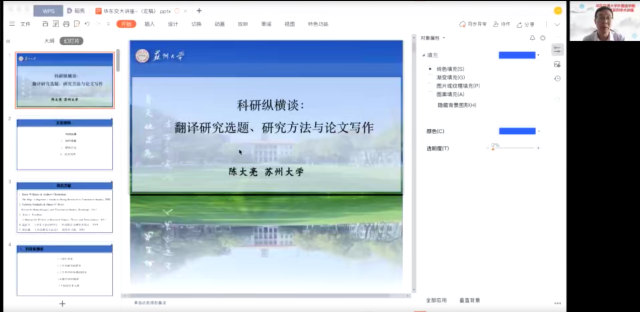 师生带来了一场题为《科研纵横谈:翻译研究的选题、方法与写作》的学术讲座。本次讲座线上进行,由吃瓜