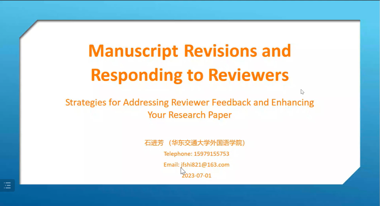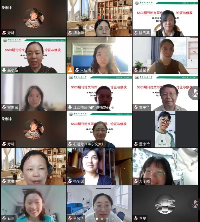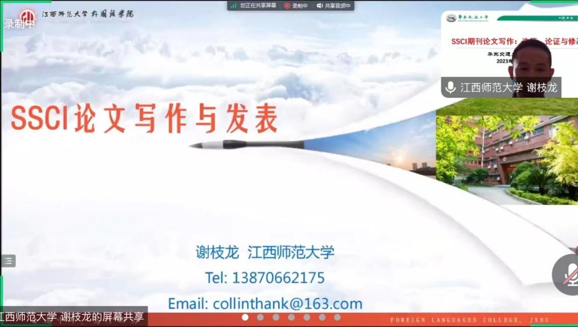 为加强学院学科建设,增强师生对国际期刊论文写作的了解,2023年 7月3日学院举办了主题为“SSCI期刊论文写作:选题、论证与修改”的系列学术讲座。讲座以线上形式进行,由江西师范大学谢枝龙教授、湖南师范大学肖越海教授和吃瓜