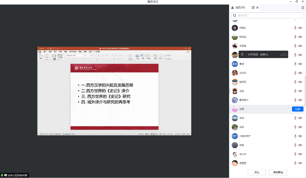 师生做了一场题为“《史记》在西方世界的译介与研究”的学术讲座,讲座由学院副院长陆秀英教授主持。讲座旨在全面梳理与介绍《史记》在西方世界的译介与研究,并就其译介方法及原因、《史记》在海外的新见解和新观点展开评析,以期展示中华传统文明的世界影响力之同时,揭示其世界性意义。