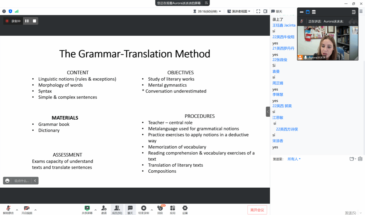 Hunt Gomez教授以其深厚的学术背景和丰富的教学经验,向学生们详细介绍了欧洲的第二语言教学和学习方法,特别是音视教学法(The Audiovisual Method)和交际教学法(The Communicative Approach)等。她还对塞维利亚大学进行了生动的介绍,让学生们对欧洲的教育文化有了更深入的了解。