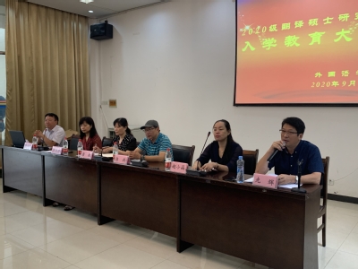 A102会议室召开。学院领导、MTI中心负责人、硕士生导师、研究生秘书及辅导员和2020级全体翻译硕士研究生参加会议,会议由副院长袁平华主持。