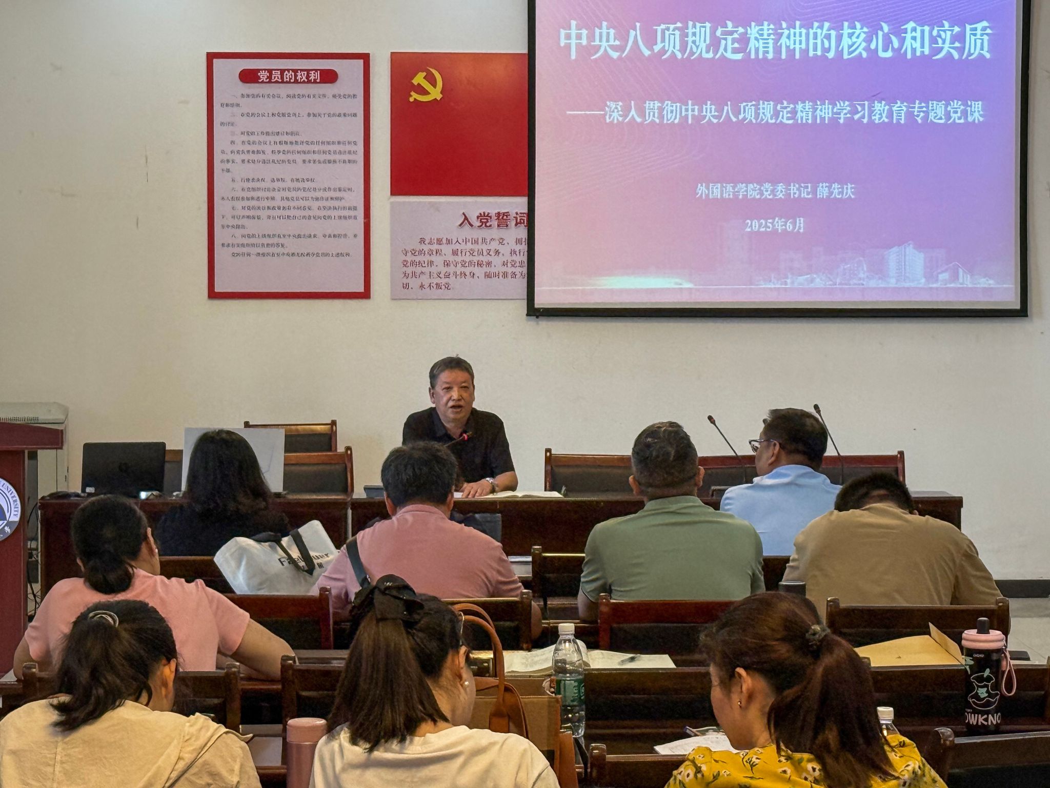 召开深入贯彻中央八项规定精神学习教育工作推进会暨专题党课,传达学习习近平总书记重要讲话和重要指示批示精神,阶段性总结学习教育推进情况,安排下一阶段重点任务,推动全院学习教育走深走实。学院党委书记薛先庆主持会议并以“中央八项规定精神的核心和实质”为题讲授专题党课,全体教工党员参加会议。