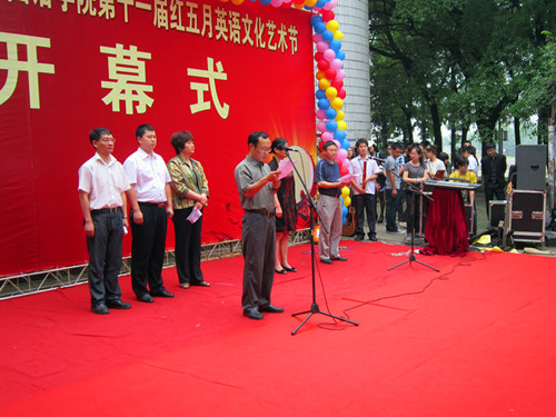 第十一届“红五月”英语文化艺术节在南区一食堂前隆重开幕,本届文化艺术节主题为“回味经典,品读名著”。到场参加开幕式的领导有校学工处处长凌四宝、校团委副书记陈沈平、吃瓜