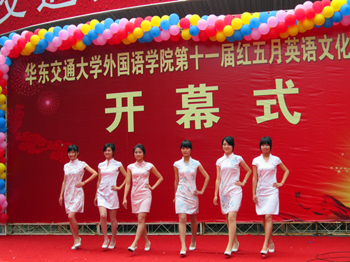 开幕式表演节目以一首学生乐队表演的英文歌曲《Nobody’s Home》拉开序幕。而来自南昌大学的同学们以一曲曲经典红歌唱响活动主题,雄浑热情的歌声让人沉醉其中。11级外院学生的爵士舞活泼俏皮、清新明朗的口琴独奏更使人耳目一新。而接下来的情歌对唱《因为爱情》俨然为开幕式增添了一抹甜蜜的色彩。在一段风趣幽默的相声表演后,开幕式现场气氛达到高潮,随后的英文歌曲联唱,甜美而灵动的歌声赢得阵阵掌声。作为开幕式的压轴节目,外语学院的女子走秀将开幕式的气氛再次推上高潮,美丽的模特们身姿绰约,颇具韵味。