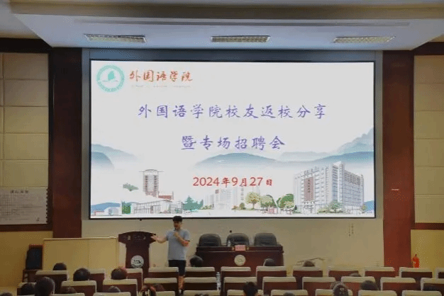 校友返校分享暨专场招聘会于图书馆202教室举行,由优秀毕业生胡文涛分享汇报,吃瓜