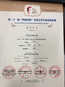 “外研社杯”全国大学生英语辩论赛由共青团中央学校部、全国学联秘书处、北京外国语大学主办,外研社承办。本届赛事从去年10月在全国各地500余所高校启动校园选拔赛,直接参与大赛的人数达数十万人。经过层层的筛选和地区决赛,每个赛区排名靠前的队伍,才能晋级参加本次的全国总决赛。我校闫璐瑶和童宁同学今年3月份从华南赛区突围,晋级全国总决赛。
