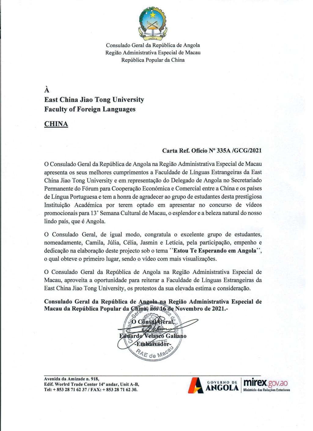 赛后,安哥拉驻澳门特别行政区总领事向我校发函,感谢我校学生向世界展示安哥拉的壮美,同时向获奖团队致以诚挚祝贺,向吃瓜