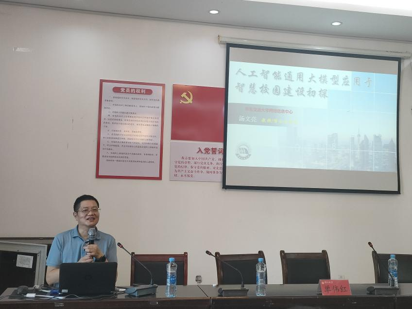 接着,汤文亮教授分享了人工智能通用大模型应用于智慧校园建设的初步探索,介绍了智慧校园的定义与建设其的必要性,是不容错过的一次变革。同时,他指出了智慧校园建设存在的问题与挑战,如教育模式的改变,科研方向的增设,技术伦理、隐私保护、数字鸿沟的问题。面对这些挑战,需要加强数字化转型思考和实践探索,推动教师课堂内容精品化、定制化,学生学习广性化,教学平台科学化,实现信息技术与外语教学融合。