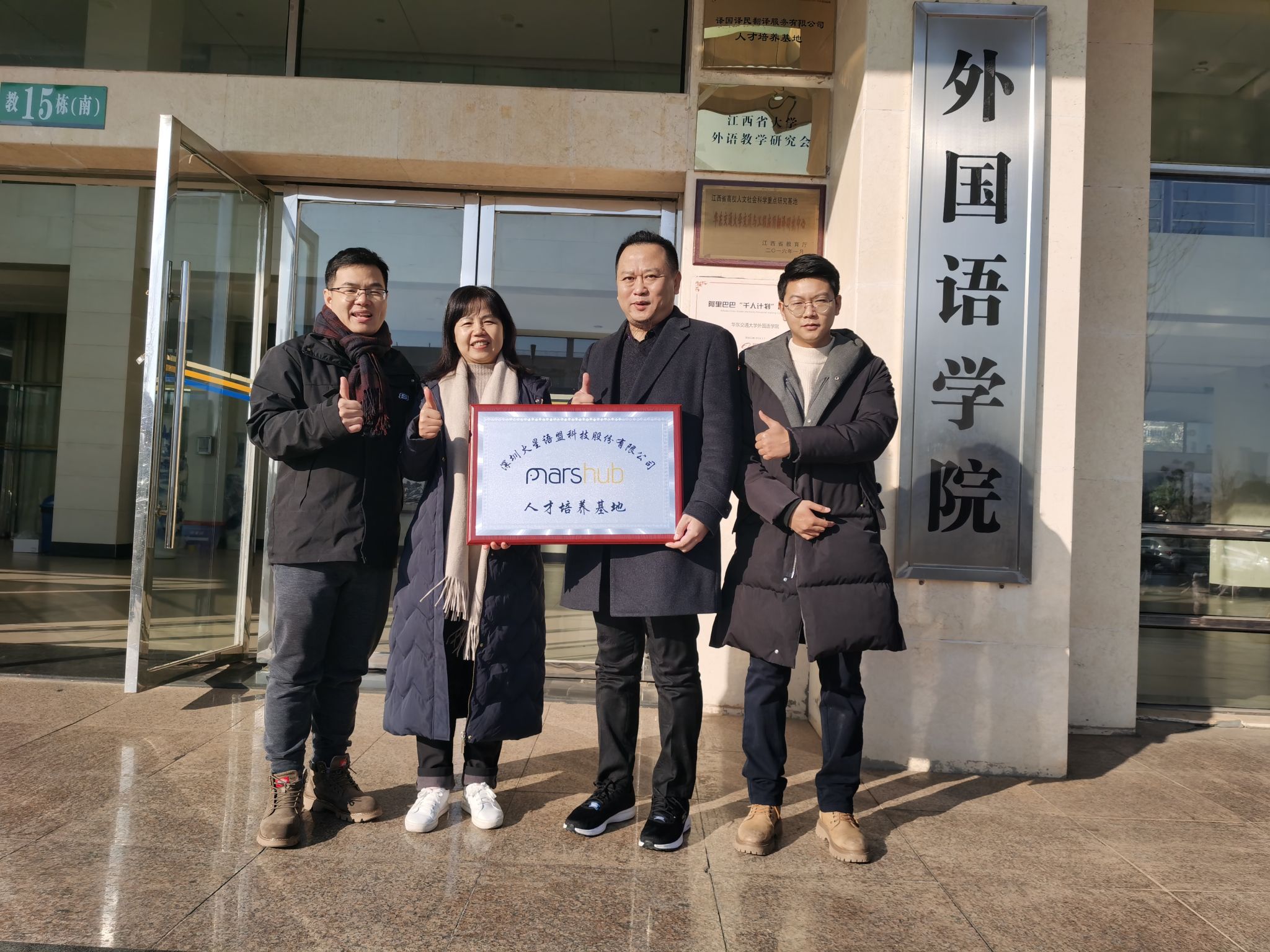 为优化人才输送,加强院企合作,推动持续发展,12月22日,外语学院与深圳市火星语盟科技股份有限公司于外语学院楼举行人才培养基地揭牌仪式。参加本次仪式的有公司副总裁、联合创始人徐徐,外语学院副院长单伟红,院党委组织员郑伟。