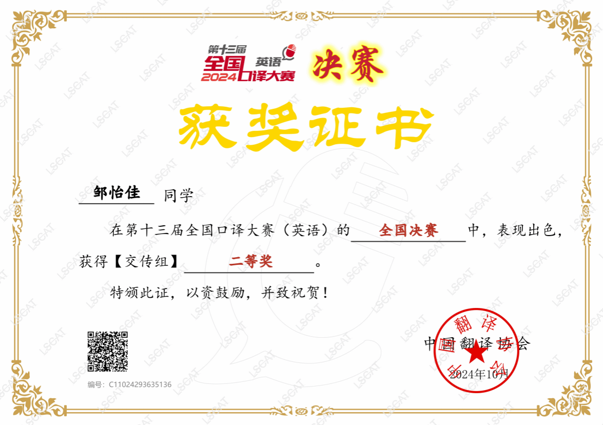 2022级翻译专业学生邹怡佳和2023级翻译硕士何玥、黄宝慧获得一等奖,2023级翻译硕士李羿雯、刘瑾霖获得二等奖,2023级翻译硕士单佳杰、唐沁雯获得三等奖。国家级决赛阶段,邹怡佳荣获二等奖,何玥、黄宝慧荣获三等奖,刘瑾霖荣获优秀奖。